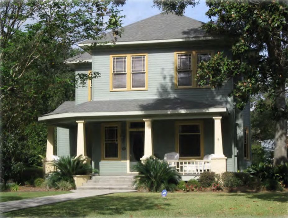 This house is a perfect example of the uniquely American Foursquare style house, which was part of the Craftsman architectural movement. It was built by Henry Herman Hohorst in 1905, on property he subdivided later, into the neighborhood, 1938 Hohorst Addition. The house remained in the Hohorst family for ninety-six years. In 2002, after the house had been empty for several years, major rehabilitation work was done to save the neglected building. A new addition was made to the rear of the house, which is not visible from the street. The front façades, visible from the street, retain their historic integrity. Henry Hohorst was a native of Galveston who moved to Lafayette around 1883. He was active in Lafayette’s civic affairs and served on the City Council and later served as Lafayette Parish Assessor.